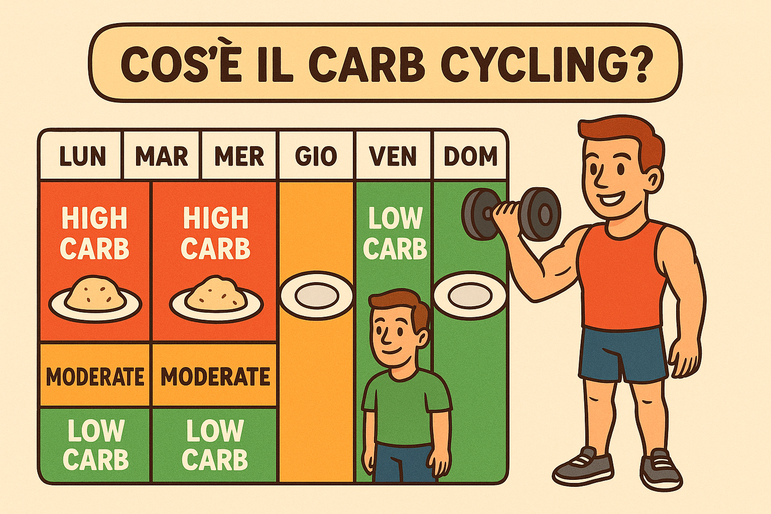 Questo è un esempio di come impostare una dieta carb cycling in modo semplice e strutturato, con esempi pratici. La ciclizzazione dei carboidrati prevede l’alternanza di giorni a basso, medio e alto contenuto di carboidrati, adattandoli al livello di attività fisica.