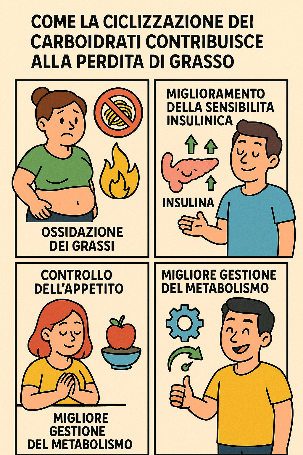 Alternare l’assunzione di carboidrati migliora la risposta del corpo all’insulina, riducendo il rischio di accumulo di grasso e favorendo un utilizzo più efficiente del glucosio.