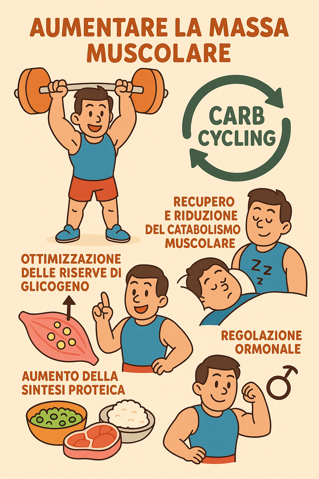 Il carb cycling stimola la sintesi proteica, il processo biologico che costruisce nuove fibre muscolari. Il consumo di carboidrati aiuta a mantenere i livelli di insulina stabili, favorendo il trasporto degli aminoacidi necessari alla crescita muscolare. Infatti in alcuni giorni della dieta sarà necessario mangiare cibi con tante proteine e pochi carboidrati.